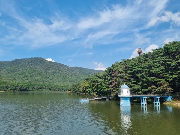 큰 나무 사이로 흐르는 바람과, 수원지의 시원한 풍경을 보며